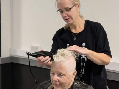 There was an extraordinary moment of bravery and solidarity at Cleethorpes Leisure Centre today (28th November), as long-standing member Janice shaved her head in front of her weekly Senior Circuits class – all in support of Breast Cancer UK.